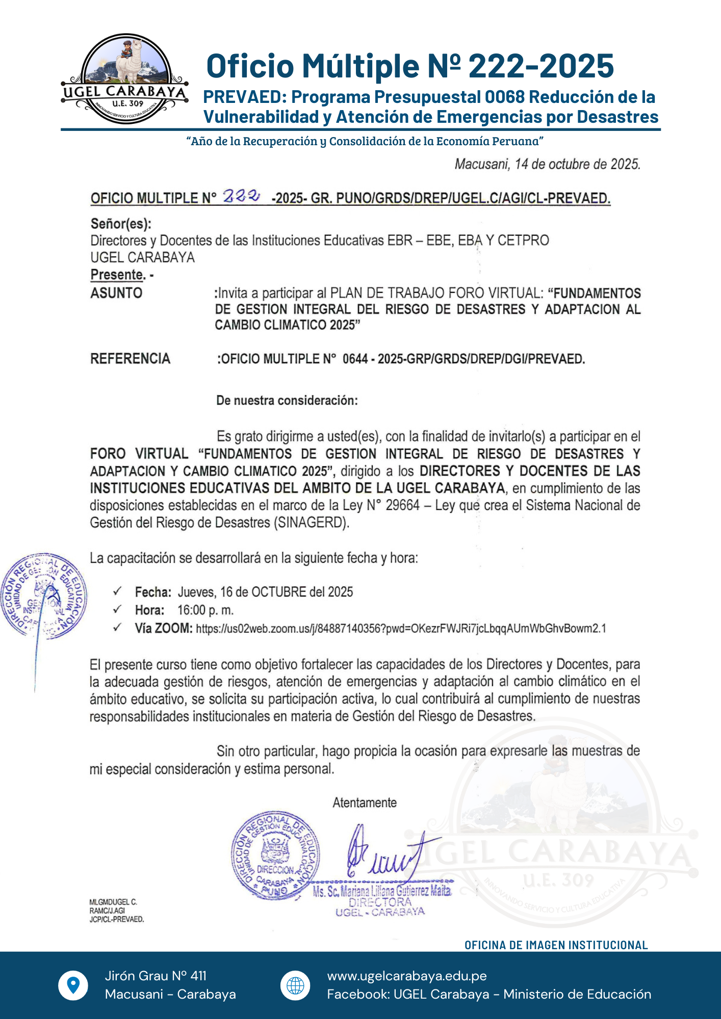INVITA A PARTICIPAR EN EL FORO VIRTUAL "FUNDAMENTOS DE GESTIÓN INTEGRAL DEL RIESGO DE DESASTRES Y ADAPTACIÓN AL CAMBIO CLIMÁTICO 2025" - UGEL CARABAYA" ✅DESCARGAR ⏭️OF. MULT. Nº 222-2025_PLAN DE TRABAJO FORO VIRTUAL Anterior Siguiente