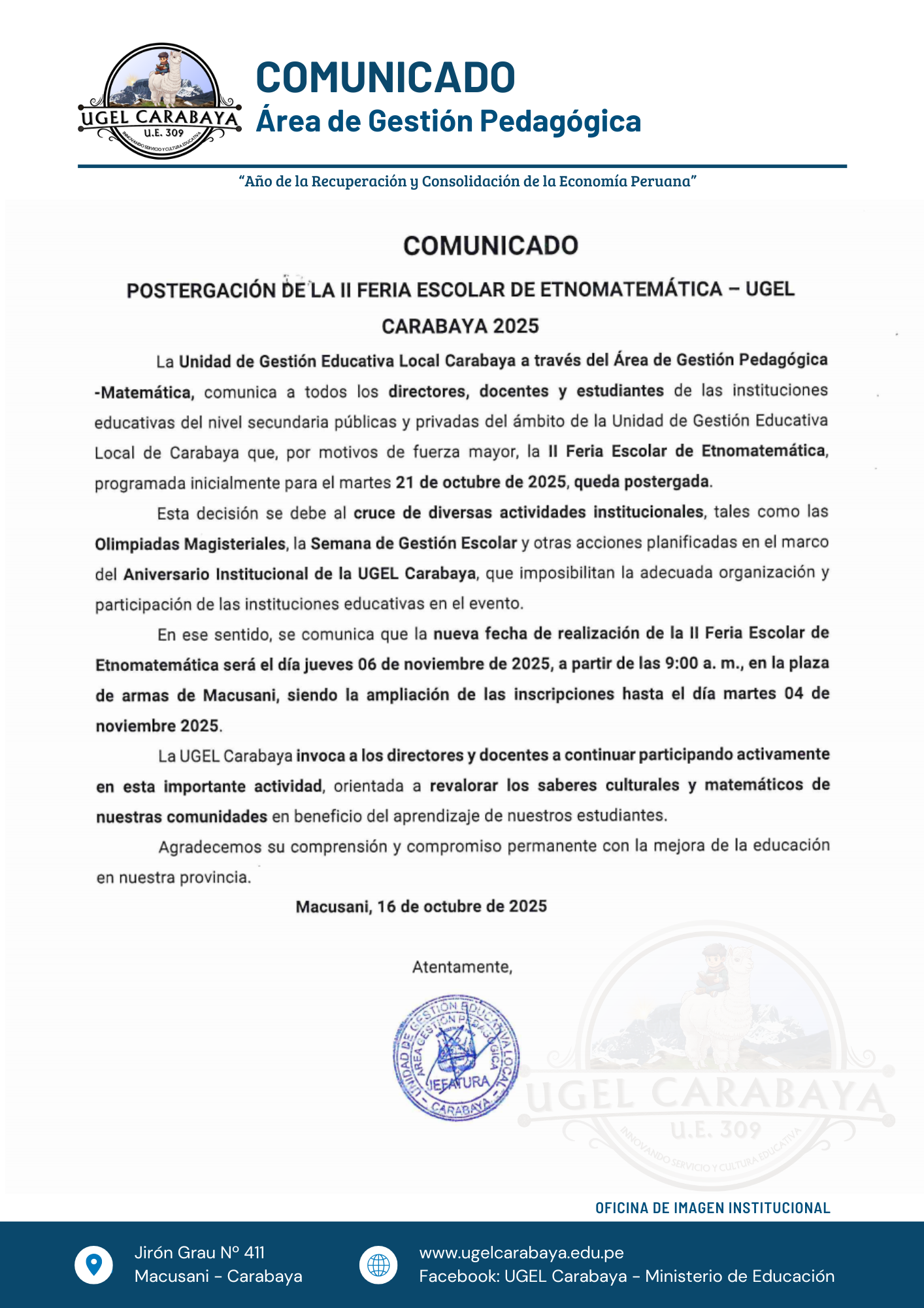 COMUNICADO DESDE EL ÁREA DE GESTIÓN PEDAGÓGICA DE LA UGEL CARABAYA: REPROGRAMACIÓN DE LA II FERIA ESCOLAR DE ETNOMATEMÁTICA 2025 PARA EL 06 DE NOVIEMBRE Anterior Siguiente