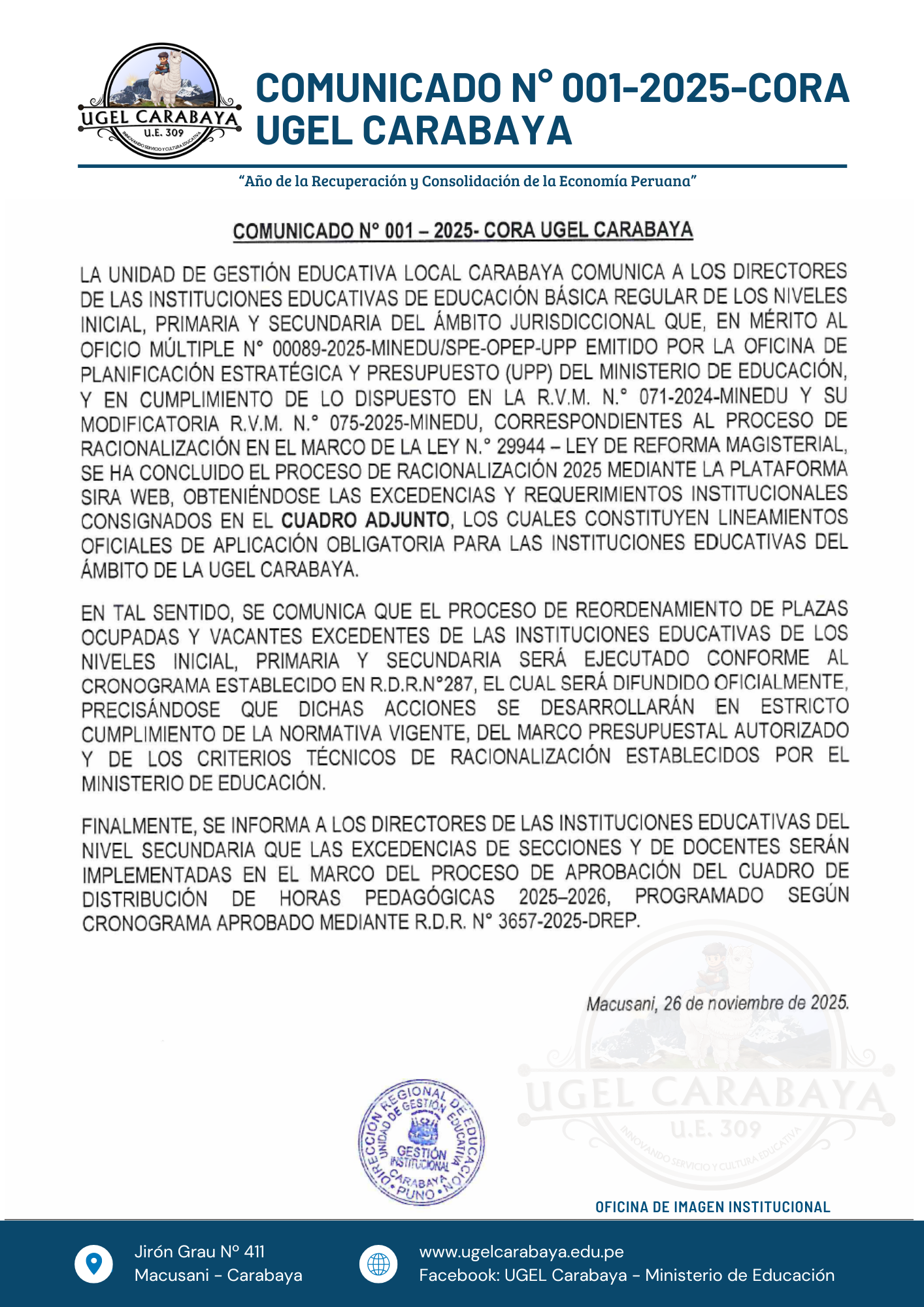 COMUNICADO Nº 001-2025-CORA UGEL CARABAYA: COMUNICA LA CONCLUSIÓN DEL PROCESO DE RACIONALIZACIÓN 2025 MEDIANTE LA PLATAFORMA SIRA WEB ✅ DESCARGAR ⏭️COMUNICADO Nº 001-2025_CUADRO ADJUNTO Anterior Siguiente