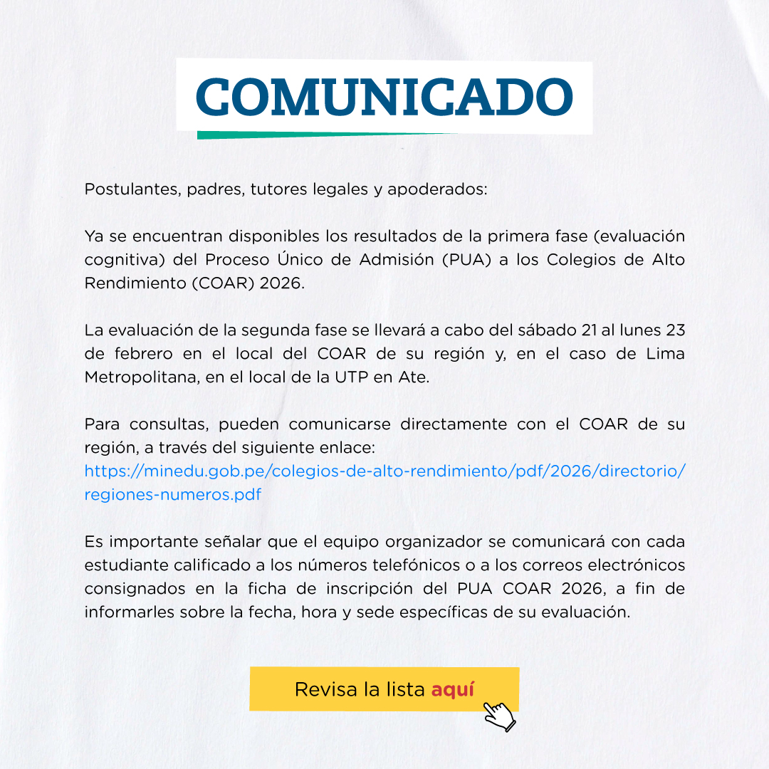 PROCESO ÚNICO DE ADMISIÓN (PUA) COAR 2026: PUBLICACIÓN DE RESULTADOS DE LA FASE I RECURSOS PARA DESCARGAR: Resultados de la Fase I Números de consultas por región