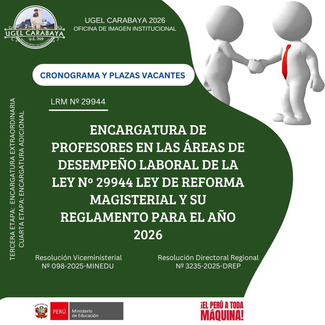 ENCARGATURA DE PROFESORES EN LAS ÁREAS DE DESEMPEÑO LABORAL DE LA LEY Nº 29944 LEY DE REFORMA MAGISTERIAL Y SU REGLAMENTO PARA EL AÑO 2026: ENCARGATURA EXTRAORDINARIA Y ADICIONAL / CRONOGRAMA Y PLAZAS VACANTES