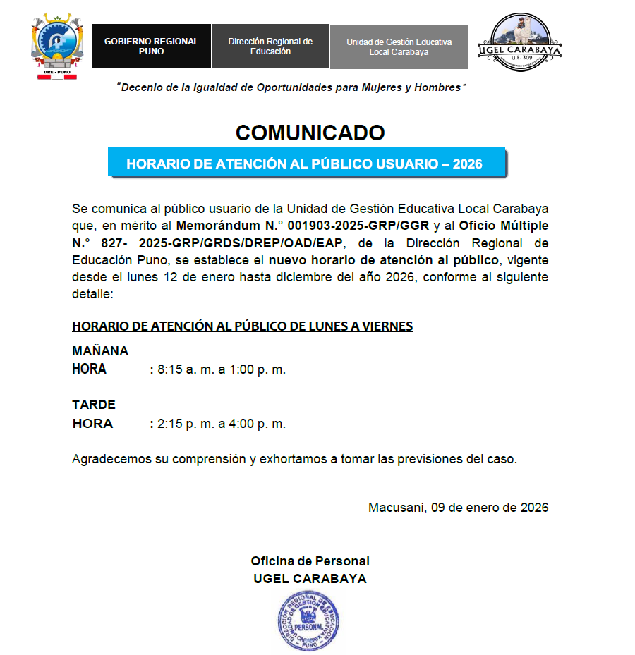 COMUNICADO HORARIO DE ATENCIÓN AL PÚBLICO USUARIO DE LA UNIDAD DE GESTIÓN EDUCATIVA LOCAL CARABAYA 2026 ✅DESCARGAR ⏭️COMUNICADO