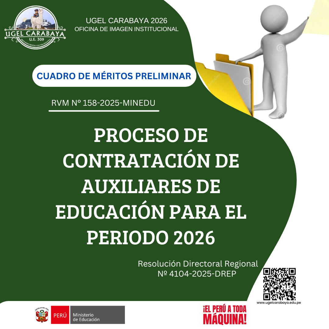 PROCESO DE CONTRATACIÓN DE AUXILIARES DE EDUCACIÓN PARA EL PERIODO 2026: PUBLICACIÓN DEL CUADRO DE MÉRITOS PRELIMINAR RECURSOS PARA DESCARGAR: 1. CUADRO DE MÉRITOS PRELIMINAR_EBE 2. CUADRO DE MÉRITOS PRELIMINAR_EBR INICIAL 3. CUADRO DE MÉRITOS PRELIMINAR_EBR SECUNDARIA
