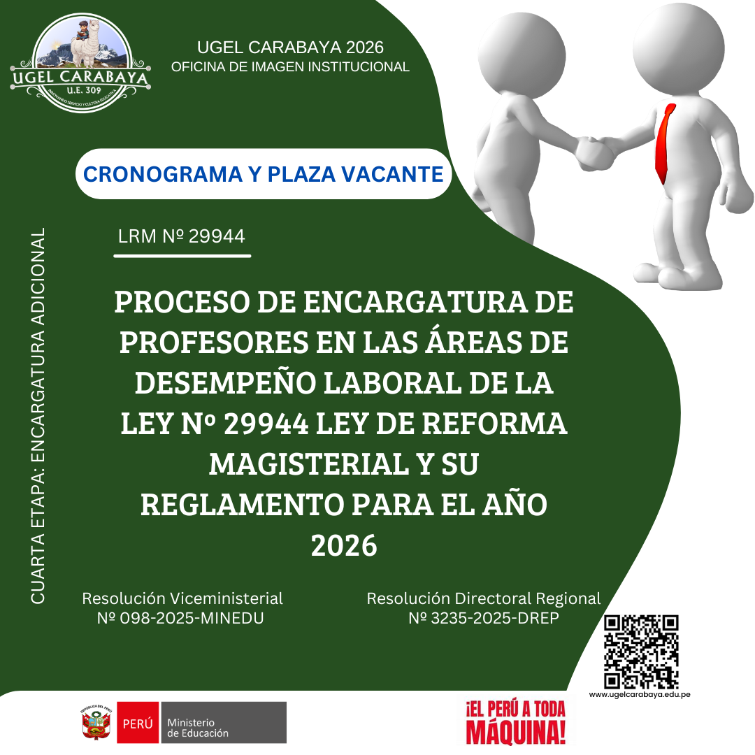 PROCESO DE ENCARGATURA DE PROFESORES EN LAS ÁREAS DE DESEMPEÑO LABORAL DE LA LEY Nº 29944 LEY DE REFORMA MAGISTERIAL Y SU REGLAMENTO PARA EL AÑO 2026: CRONOGRAMA Y PLAZA VACANTE - EDUCACIÓN INICIAL RECURSOS PARA DESCARGAR: 1. CRONOGRAMA 2. PLAZA VACANTE