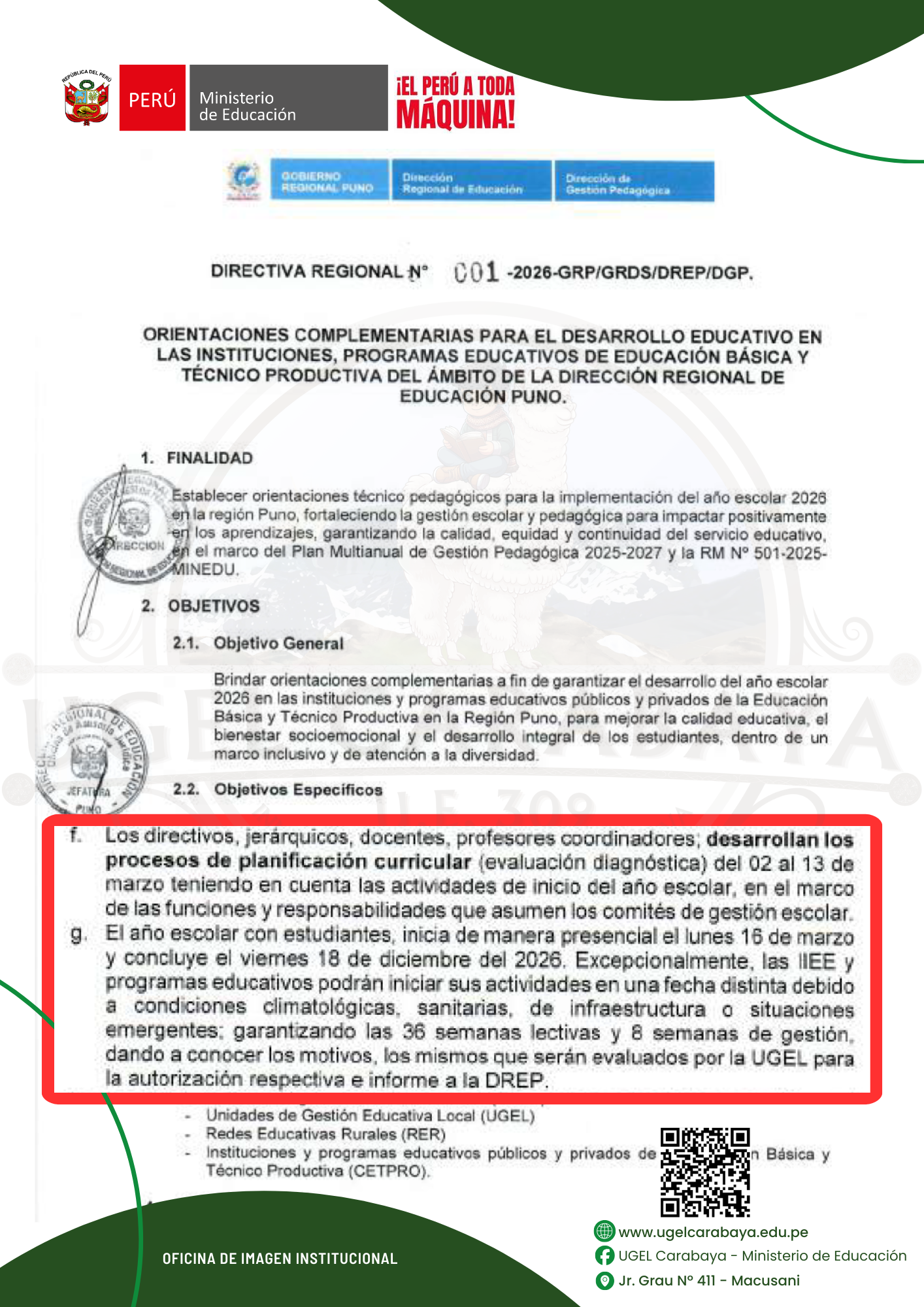 DIRECTIVA REGIONAL Nº Nº 001-2026-GRP/GRDS/DREP/DGP: ORIENTACIONES COMPLEMENTARIAS PARA EL DESARROLLO EDUCATIVO EN LAS INSTITUCIONES, PROGRAMAS EDUCATIVOS DE EDUCACIÓN BÁSICA Y TÉCNICO PRODUCTIVA DEL ÁMBITO DE LA DIRECCIÓN REGIONAL DE EDUCACIÓN PUNO. RECURSOS PARA DESCARGAR: 1. DIRECTIVA REGIONAL Nº 001-2026