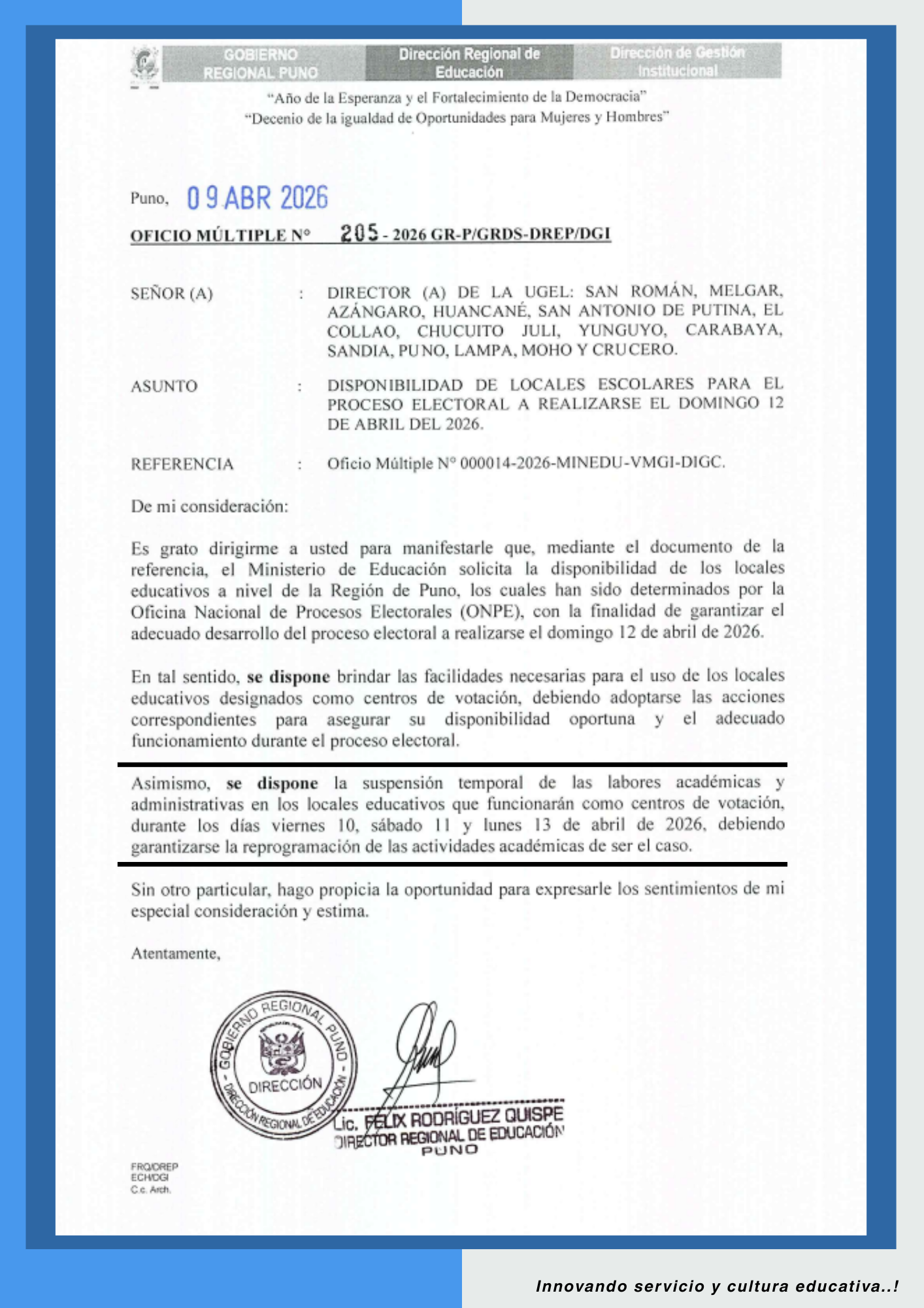 SUSPENCIÓN TEMPORAL DE LABORES ACADÉMICAS Y ADMINISTRATIVAS EN LOS LOCALES EDUCATIVOS QUE FUNCIONARAN COMO CENTROS DE VOTACIÓN