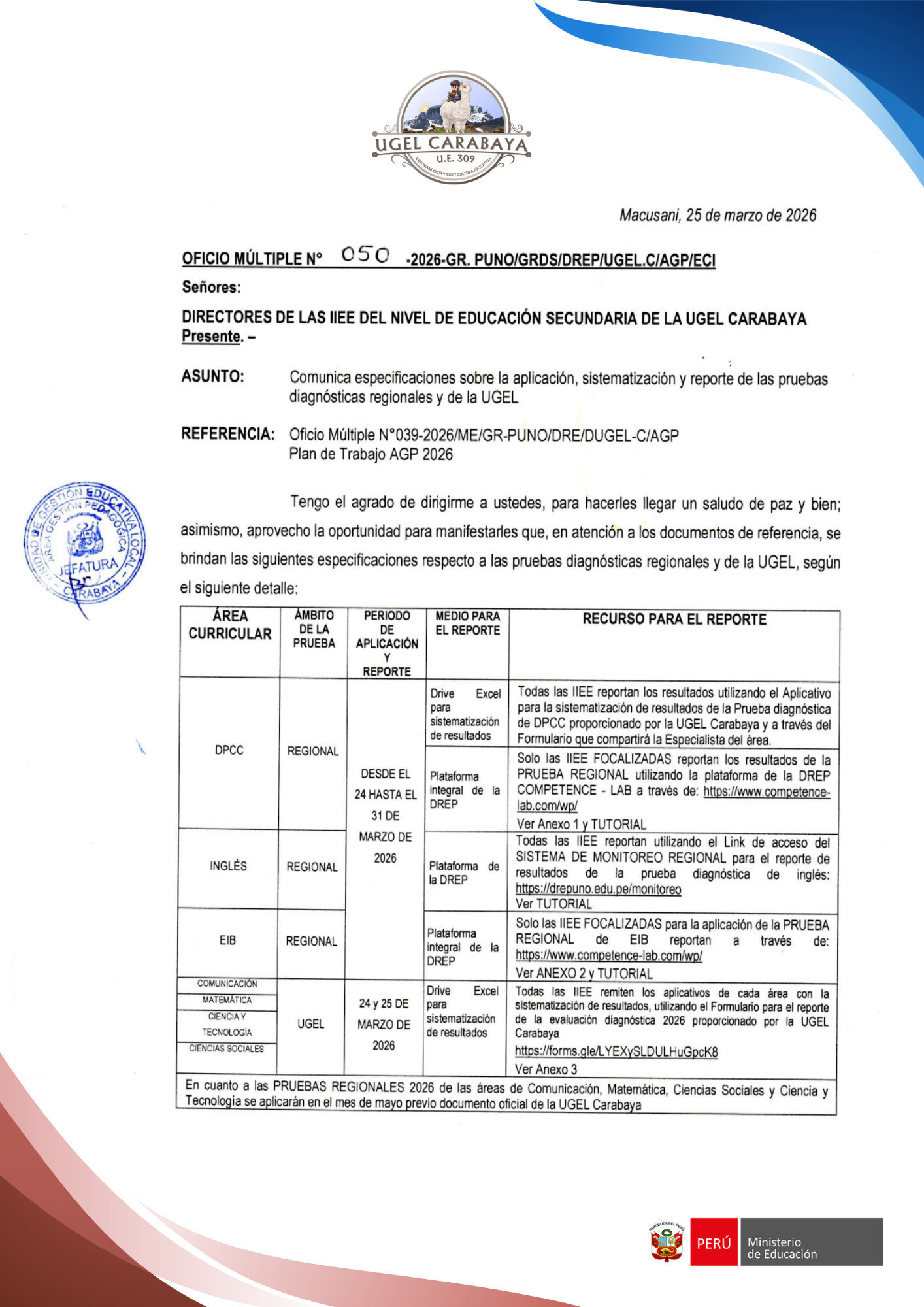 Todas las IIEE - Formulario para el reporte de la evaluación diagnóstica 2026 proporcionado por la UGEL Carabaya :https://forms.gle/LYEXySLDULHuGpcK8