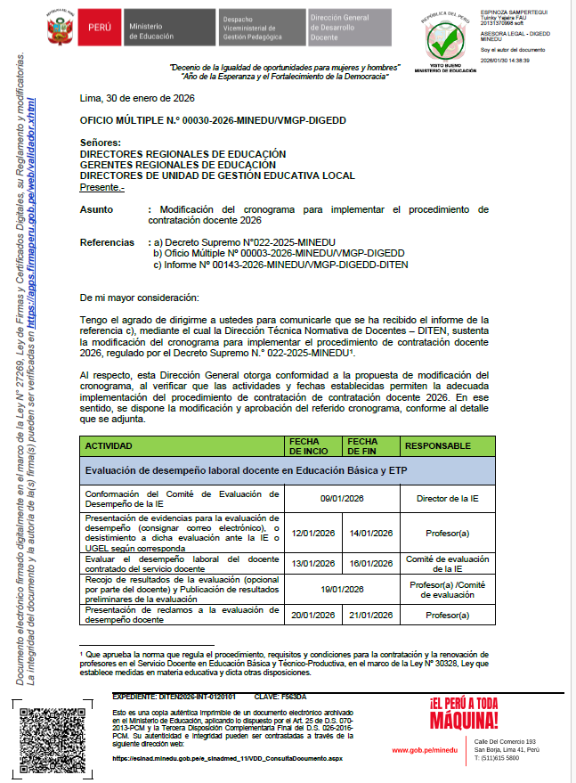 MODIFICACIÓN DEL CRONOGRAMA PARA IMPLEMENTAR EL PROCEDIMIENTO DE CONTRATACIÓN DOCENTE 2026 RECURSOS PARA DESCARGAR: 1. OFICIO_MULTIPLE-00030-2026-MINEDU/VMGP-DIGEDD
