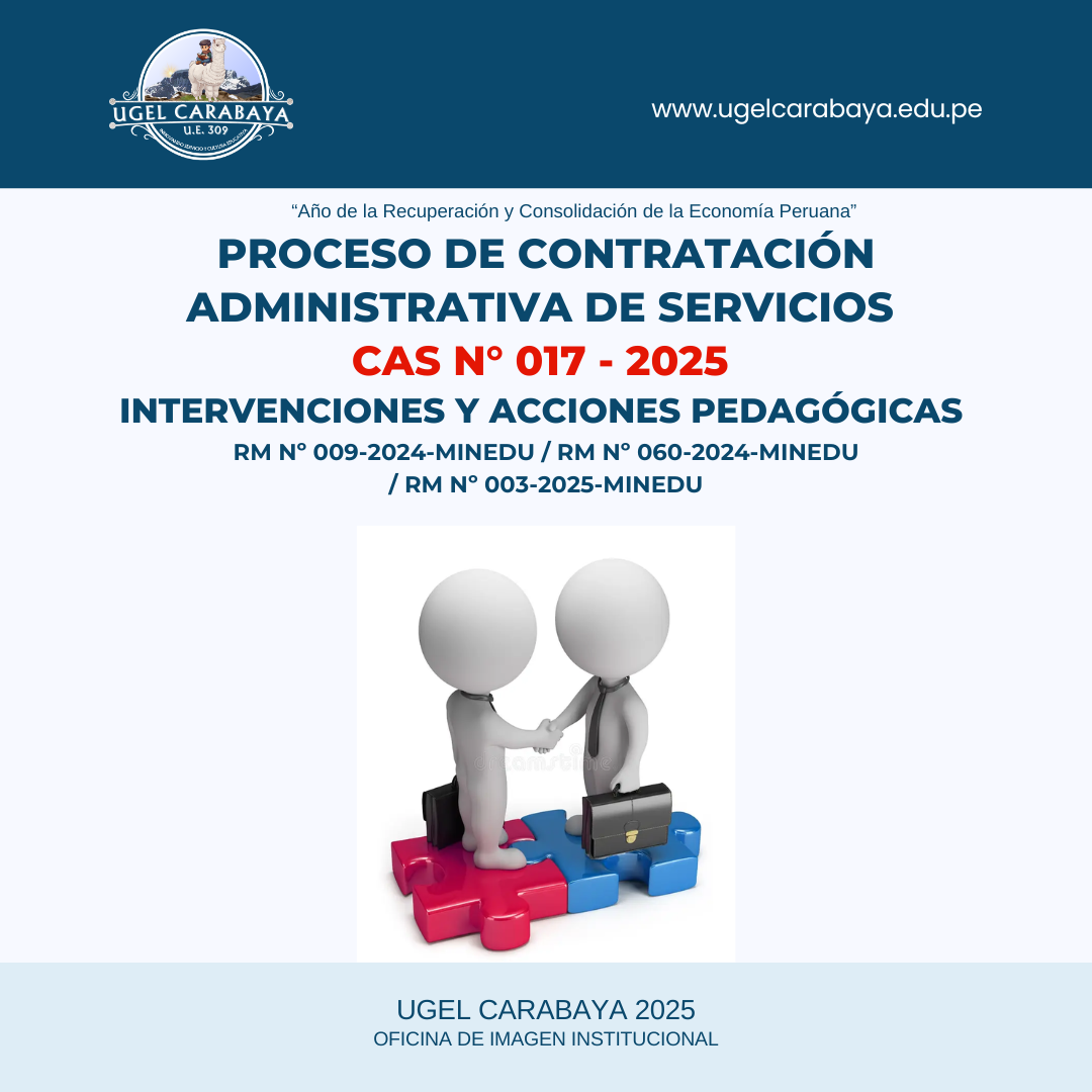 PROCESO DE CONTRATACIÓN ADMINISTRATIVA DE SERVICIOS CAS Nº 017-2025 - INTERVENCIONES Y ACCIONES PEDAGÓGICAS: CONVOCATORIA Y CRONOGRAMA DEL PROCESO ✅ DESCARGAR ⏭️CRONOGRAMA DEL PROCESO ✅ DESCARGAR ⏭️TDR_CIST ✅ DESCARGAR ⏭️ ANEXOS Anterior Siguiente
