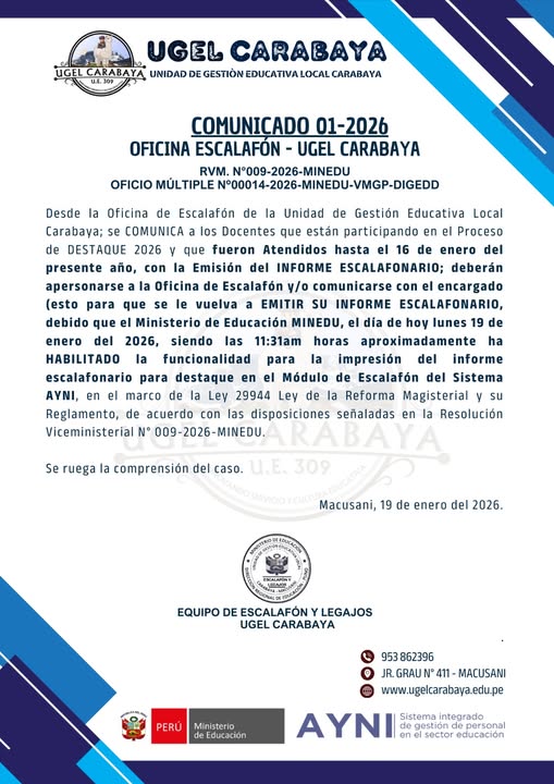 COMUNICADO OFICIAL DESDE LA OFICINA DE ESCALAFÓN DE LA UGEL CARABAYA 2026