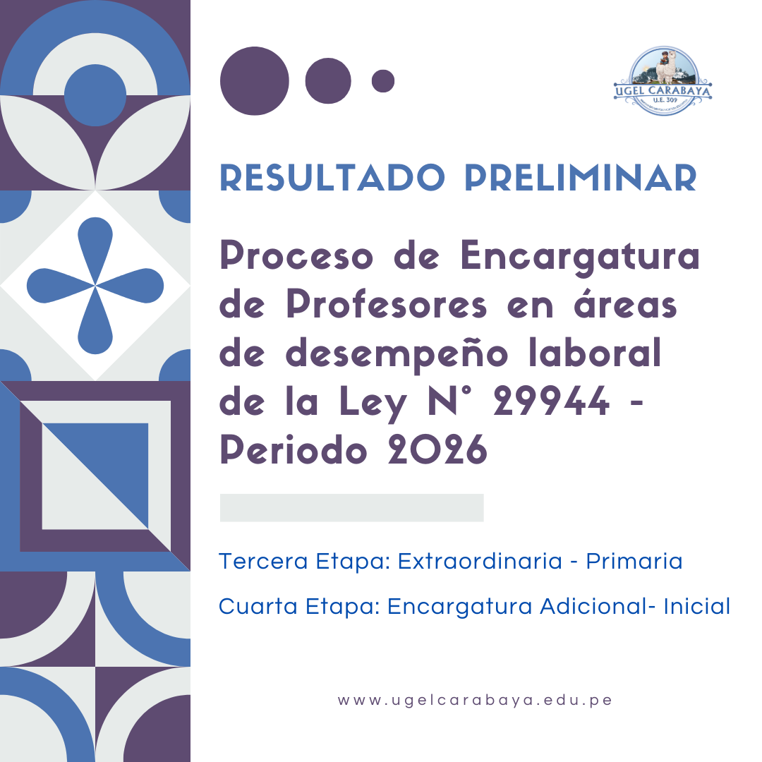 PROCESO DE ENCARGATURA DE PROFESORES EN ÁREAS DE DESEMPEÑO LABORAL DE LA LEY N° 29944 - PERIODO 2026 - RESULTADO PRELIMINAR RECURSOS PARA DESCARGAR: RESULTADO PRELIMINAR DE CUADRO DE MÉRITO - NIVEL PRIMARIA RESULTADO PRELIMINAR DE CUADRO DE MÉRITO - NIVEL INICIAL Anterior Siguiente