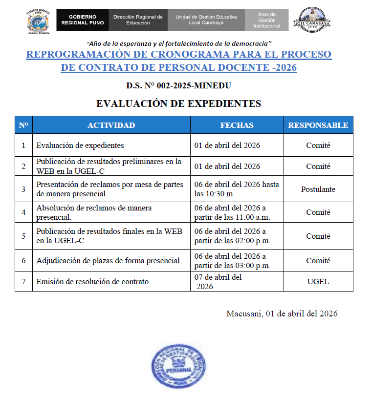REPROGRAMACIÓN DE CRONOGRAMA PARA EL PROCESO DE CONTRATO DE PERSONAL DOCENTE-2026