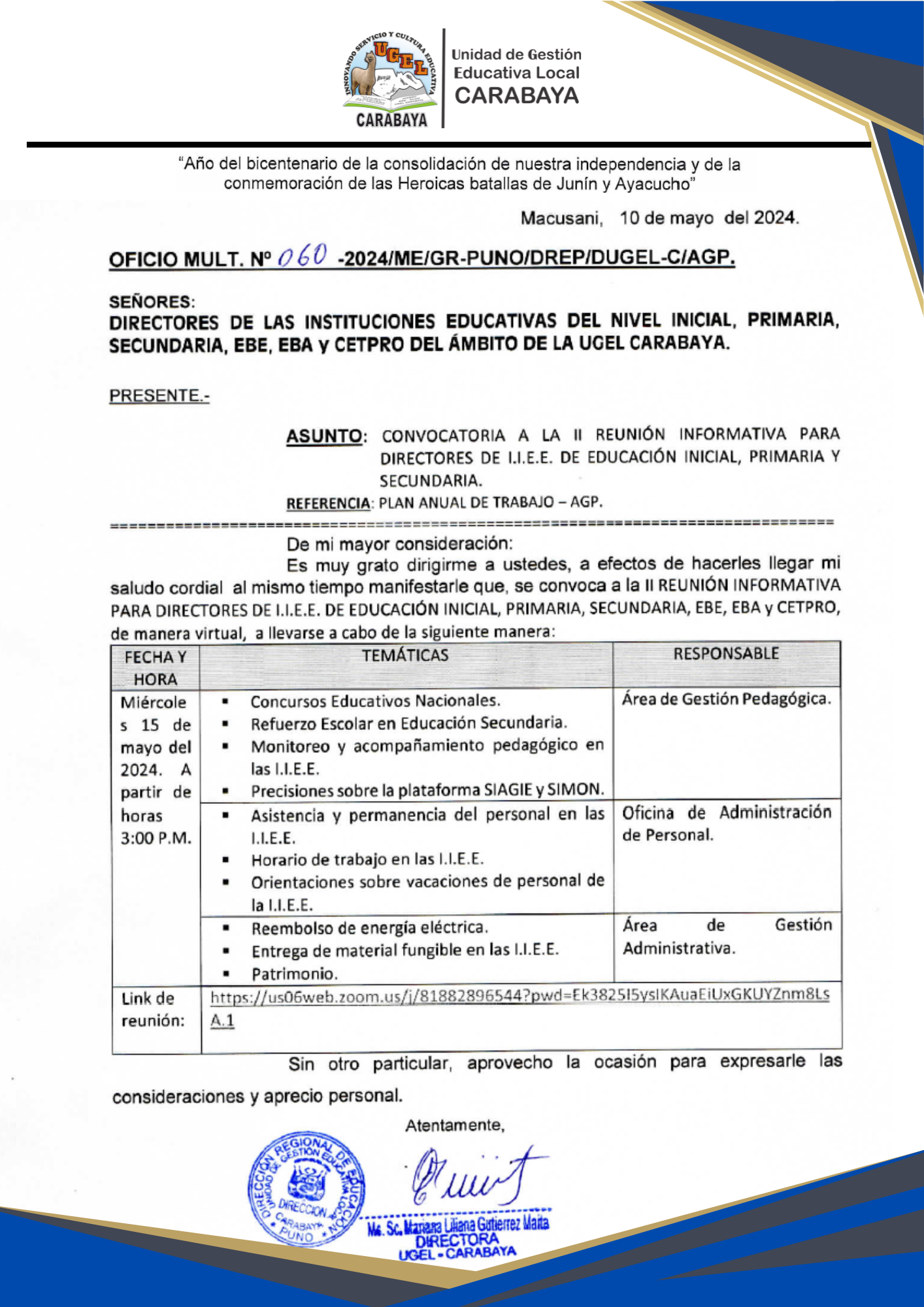 DIRECTORES DE LAS INSTITUCIONES EDUCATIVAS SECUNDARIAS DEL ÁMBITO DE LA UGEL CARABAYA: REMITO DIRECTIVA REGIONAL "ORIENTACIONES PARA LA IMPLEMENTACIÓN DE LAS COMUNIDADES DE PRÁCTICA INGLÉS EN LAS IIEE PÚBLICAS DEL NIVEL SECUNDARIO..."